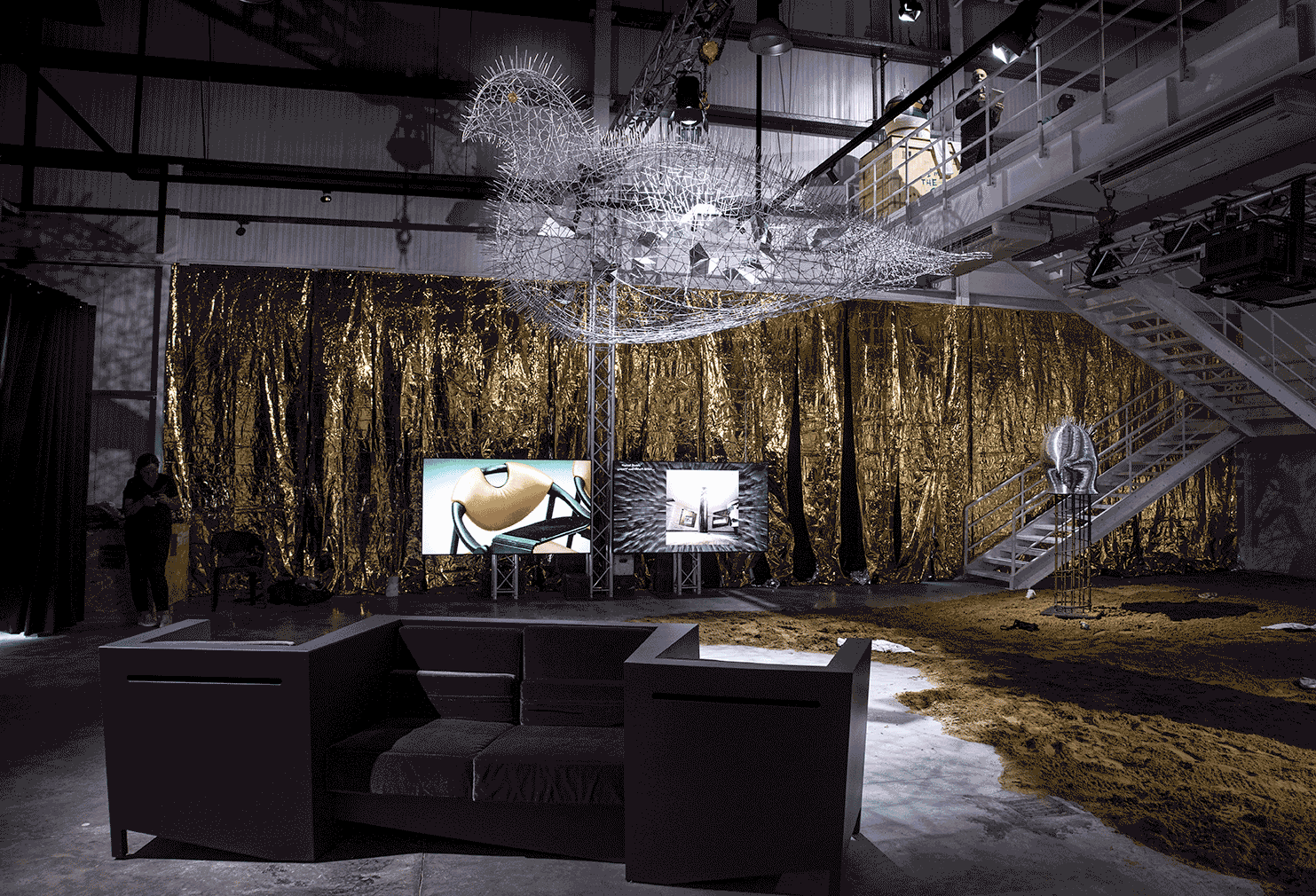 DISSUADER – ESEMPLARE UNICO. REALIZZATO IN ACCIAIO INOX MODELLATO E ASSEMBLATO MEDIANTE SALDATURA. LAMINE IN LASTRE DI ACCIAIO INOX SAGOMATE E LUCIDATE A SPECCHIO. PREDISPOSTO PER ESSERE SOSPESO MEDIANTE CAVI E TIRANTI IN INOX.